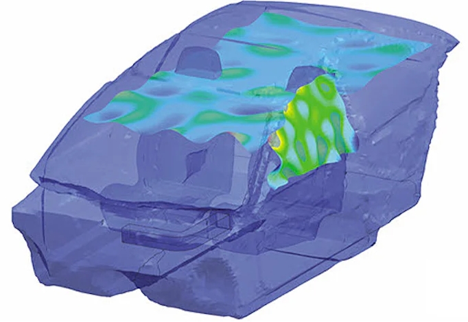 用于聲學(xué)分析的有限元法是室內(nèi)聲學(xué)問題仿真的理想選擇。聲學(xué)有限元法不僅在解算速度方面更為高效,還讓您可以進(jìn)行聲振耦合分析,同時將結(jié)構(gòu)模態(tài)和隔音材料考慮在內(nèi)。聲學(xué)有限元法還可以輕松用于解決外部聲學(xué)問題,例如動力總成組件(例如進(jìn)氣系統(tǒng)、變速箱或全電動驅(qū)動單元)的噪聲輻射分析。
